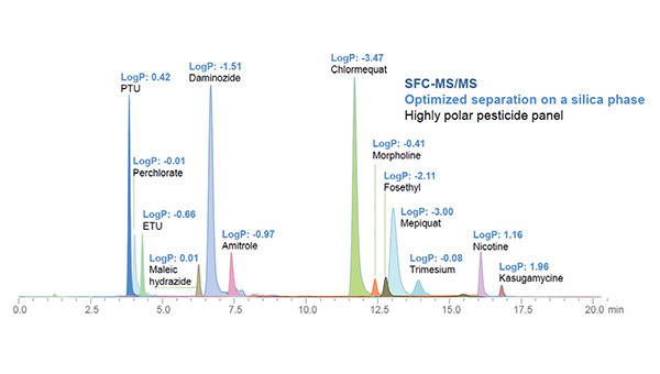 An alternative approach utilised supercritical fluid chromatography and a mixed mode ternary gradient which provided superior retention of highly polar pesticides over reversed phase strategies.